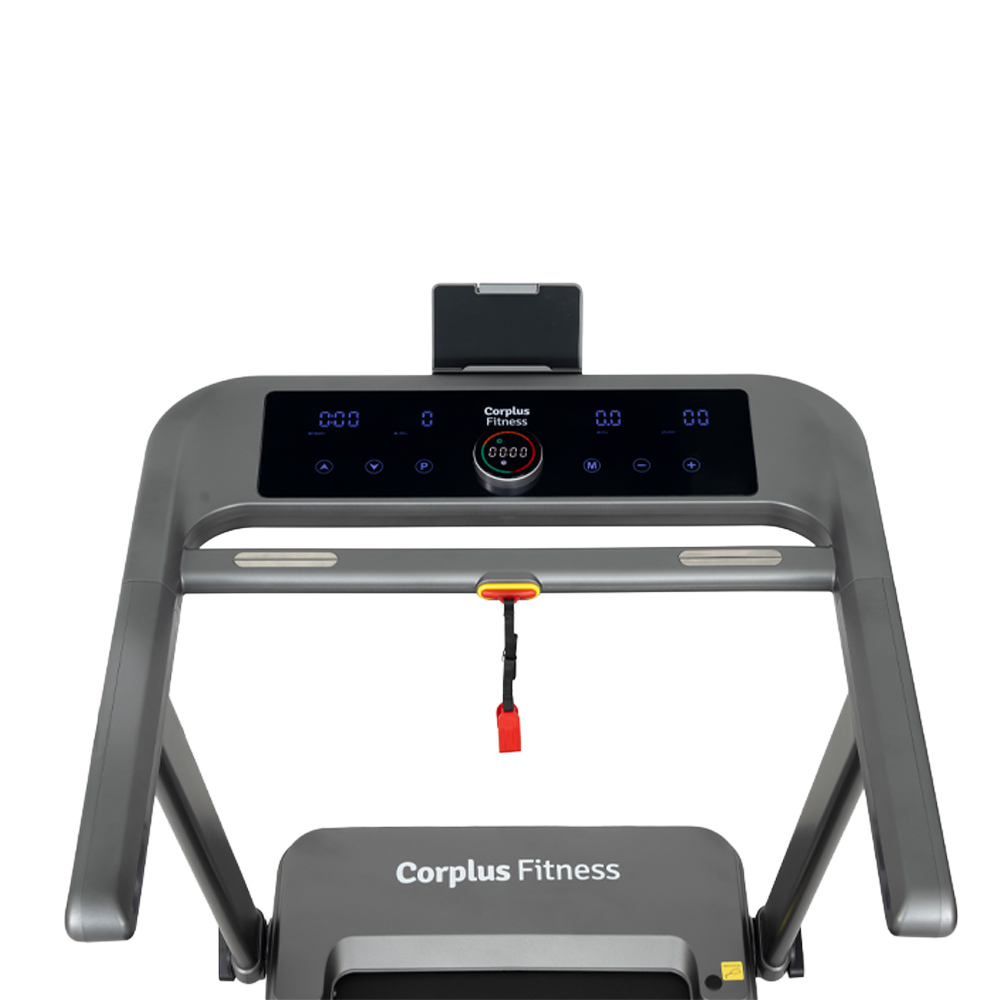 Las imágenes son ilustrativas, con el fin de mostrar todas las características de la cinta. La pantalla del equipo Corplus A#Maxim brinda información de tiempo, distancia, velocidad, calorías, pulso, inclinación y programas. Las aplicaciones no están incluidas en el producto, ni se muestran en la pantalla de la cinta. Las aplicaciones se descargan en celulares, tablets, smart TVs o computadoras según la compatibilidad de los dispositivos. Estos dispositivos no vienen incluidos en la compra del equipo.